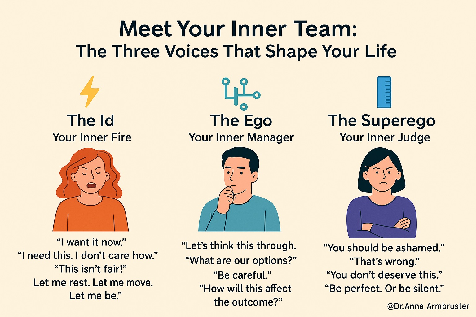 In classical psychoanalysis, they’re called the Id, Ego, and Superego. In Transactional Analyses and Schema Therapy, you might meet them as the Inner Child, the Adult, or the Parent. Internal Family Systems (IFS) calls them Parts—Exiles, Managers and Firefighters. The language varies, but what they all point to is the same thing: